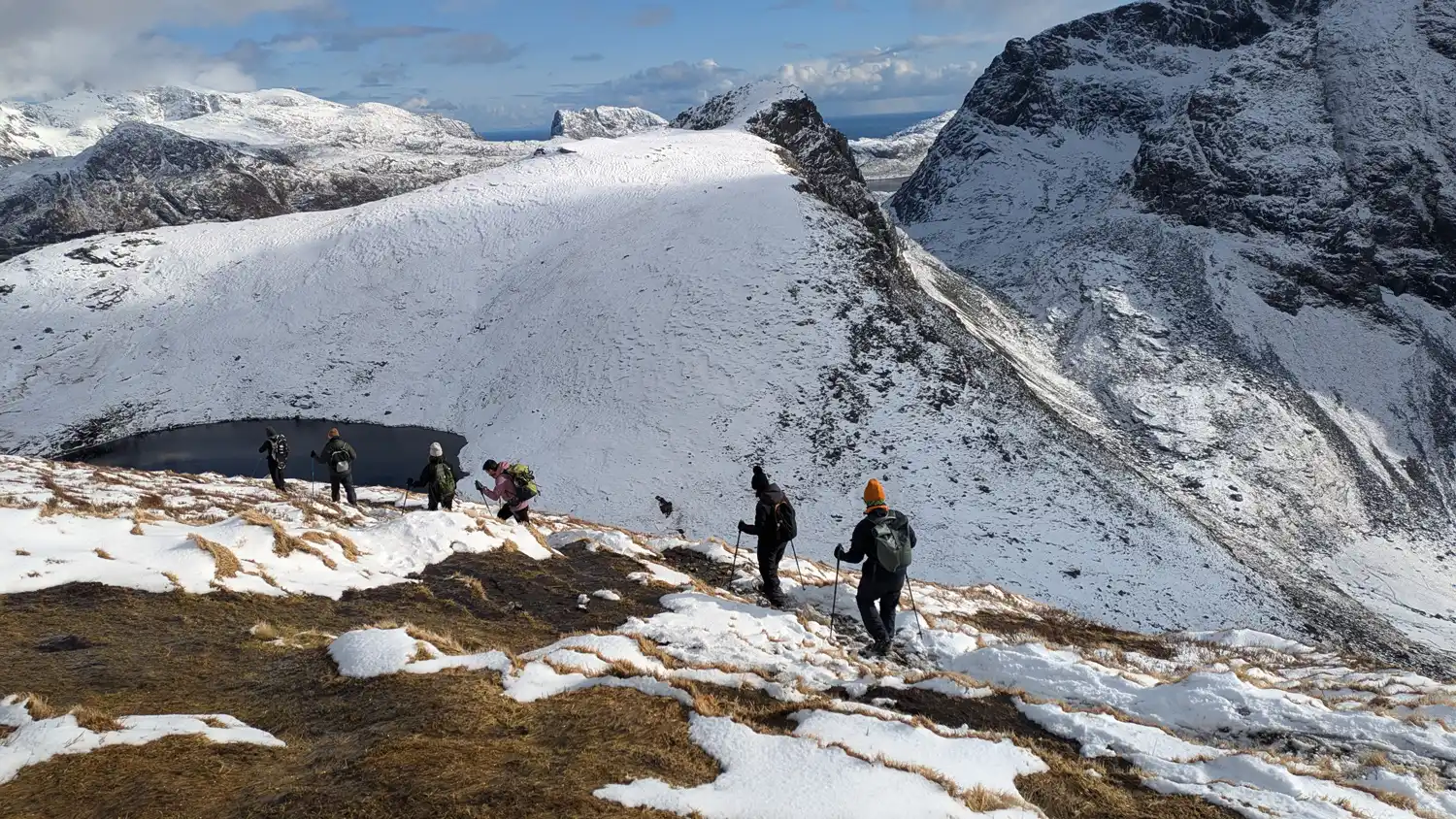 After photos, rest, and reflection, we descend together, returning to the starting point with tired legs, warm hearts, and lasting memories from a true winter hiking adventure in Lofoten.