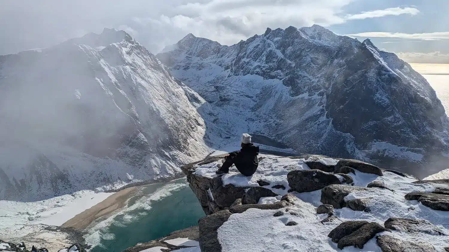 At the summit, we take time to pause and enjoy the moment. From here, the winter hiking views in Lofoten are truly spectacular – fjords stretching toward the horizon, snow-covered peaks, and the quiet calm that defines the Arctic winter.